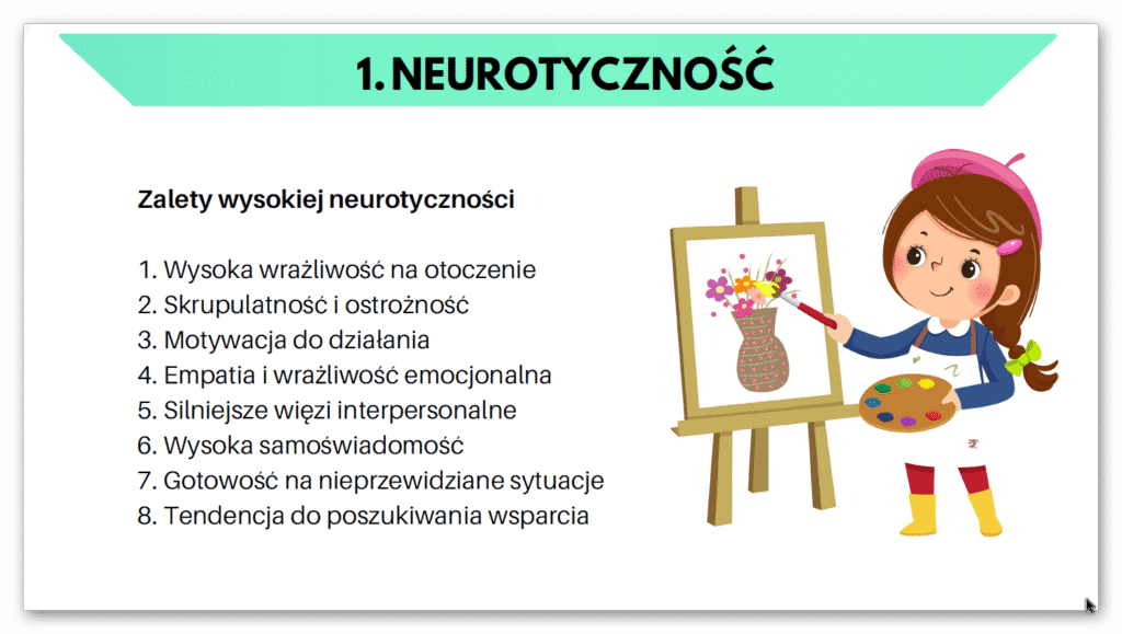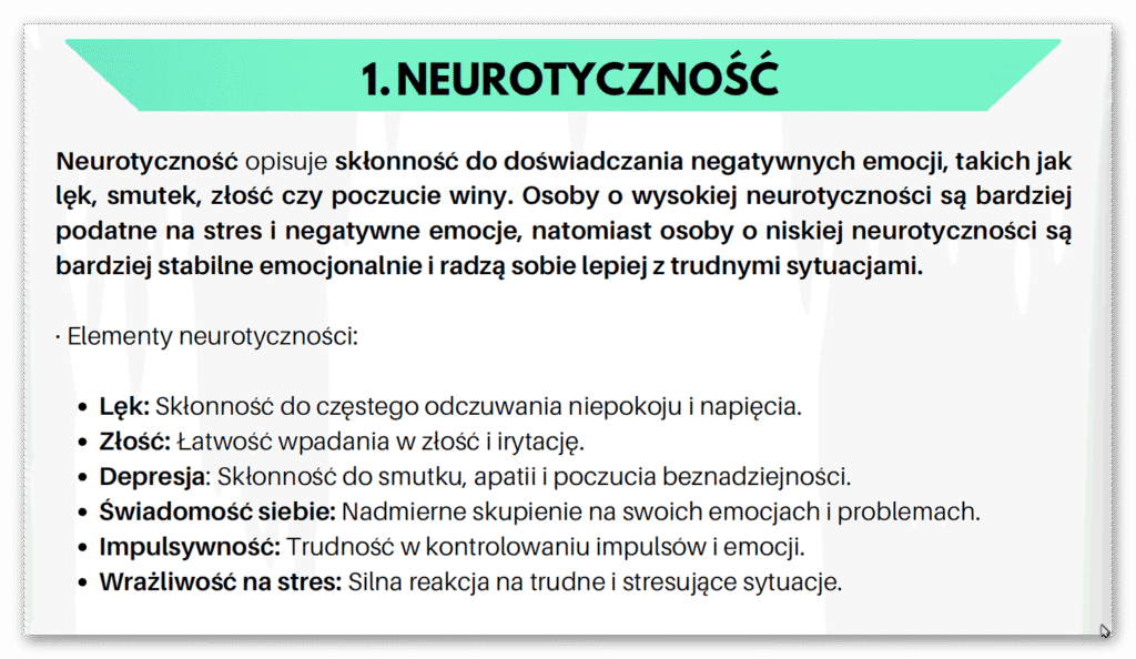 🟣 Osoby z wysoką neurotycznością są bardziej wrażliwe, intensywnie przeżywają wszystko, łatwiej ulegają stresowi.
