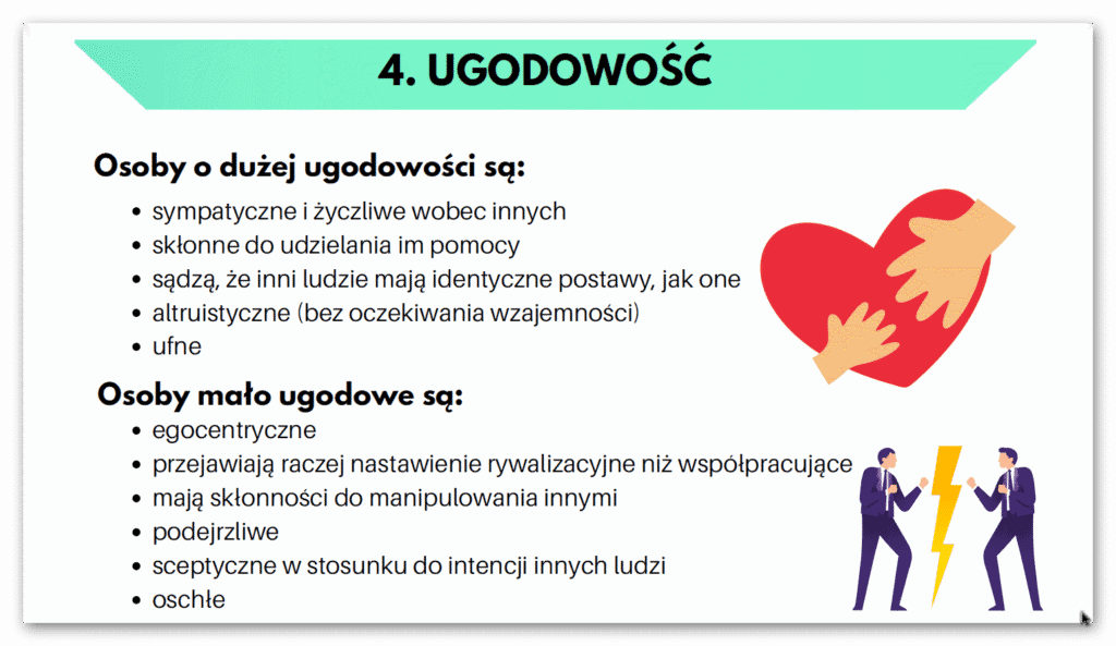 Ugodowość to cecha, która opisuje, jak bardzo jesteśmy skłonni do współpracy, troski, empatii i pomagania 🤲.